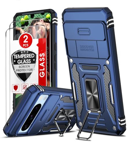 DEERLAMN Coque pour Google Pixel 8 avec Coque coulissante pour Appareil Photo + Protecteur d'écran (1 Paquet), Anneau Rotatif, béquille de qualité Militaire, résistant aux Chocs, Bleu Marine