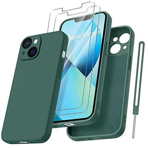 Qasyfanc Coque Protection Caméra pour iPhone 13 Mini avec 2 Pièces Verre Trempé, Housse de Protection Silicone Antichoc Doublure Microfibre Douce Ultra Fine Coque iPhone 13 Mini - Vert foncé
