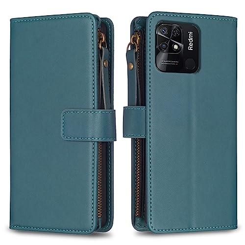 Jiajihua Coque Compatible avec Redmi 10C 4G / 10 (lndia) 4G,Compatible avec Xiaomi Poco C40 Lanyard Portefeuille à Fermeture éclair Support Rabattable Fentes pour Cartes Fermeture magnétique Green
