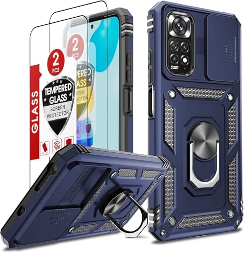LeYi Coque Xiaomi Redmi Note 11/11S 4G Protection Camera 2 Verres Trempés Anneau Support Militaire Bumper Antichoc Rigide Armure Bleu