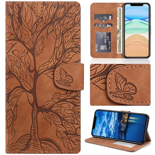 Aisenth Coque pour Redmi Note 11 4G/Redmi Note 11S, Arbre de Vie Papillon Motif Housse Case en Cuir Synthétique Cover à Rabat, Portefeuille Étui de Protection avec Fentes pour Cartes, Brun