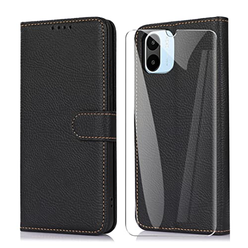 THIYUFUNS Coque pour Xiaomi Redmi A1 / Redmi A2 4G avec Verre Trempé Protection écran,Housse Cuir PU Portefeuille Magnétique pour Xiaomi Redmi A1 / Redmi A2 4G - Noir