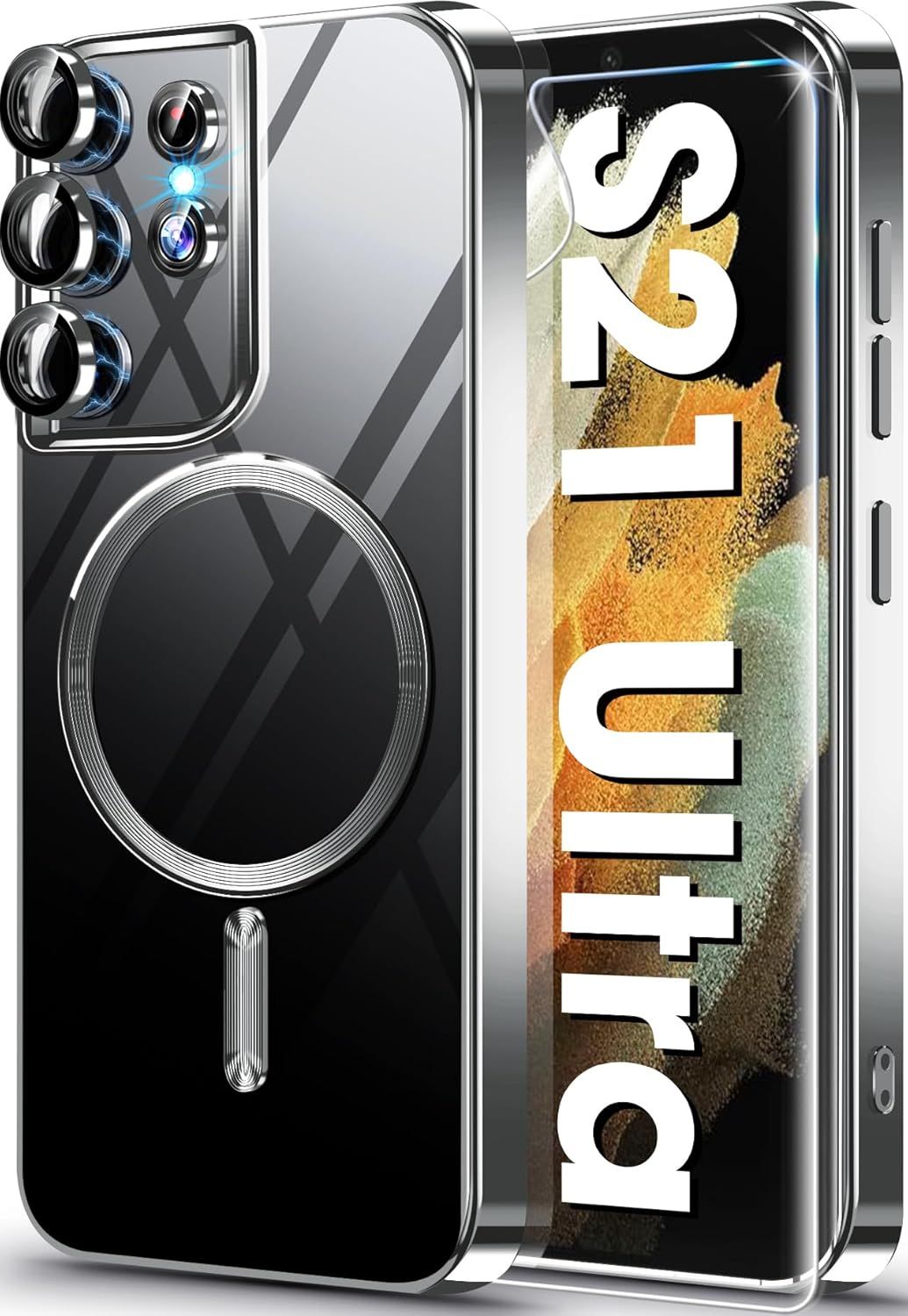 LORANKA-Coque pour Samsung Galaxy S21 Ultra avec Mag-Safe Magnétique Protection Caméra [avec Film de Protection] Transparent Anti-Jaune TPU Souple Bumper Antichoc Coque Samsung S21 Ultra (Argenté)