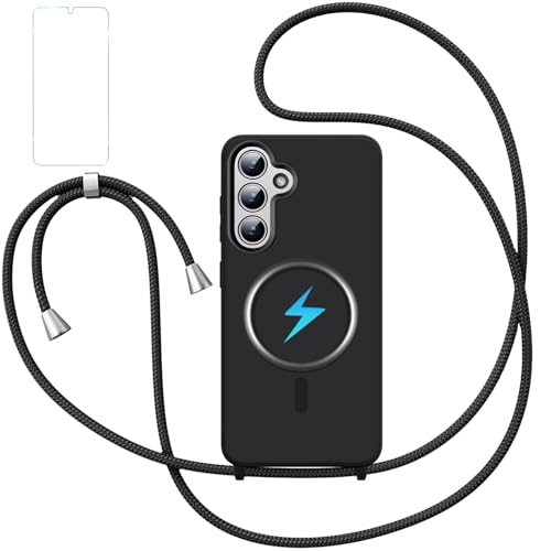 Migexxkj Coque pour Samsung Galaxy S25 Plus avec Cordon et Verre Trempé,Coque S25 Plus 5GMagnétique avec Mag-Safe, Etui en Silicone TPU Souple, Chaîne Ultra Fine en Microfibre avec Collier (Noir)