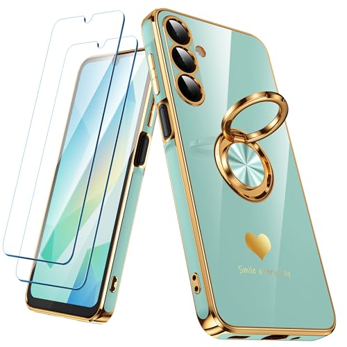 Nonional Coque pour Samsung Galaxy A16 5G avec 2 Films protecteurs d'écran, Anneau Rotatif à 360°, Motif cœurs de Luxe, Bords dorés - Coque Fine et Souple pour Samsung Galaxy A16 5G - Menthe