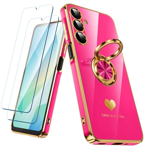 Nonional Coque pour Samsung Galaxy A16 5G avec 2 Films protecteurs d'écran, Anneau Rotatif à 360°, Motif cœurs de Luxe, Bords dorés - Coque Fine et Souple pour Samsung Galaxy A16 5G - Rose Vif