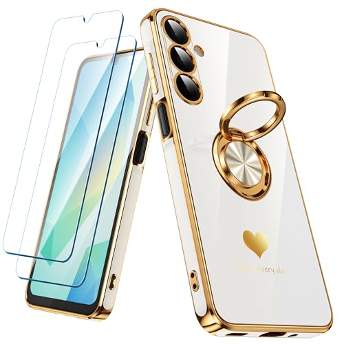 Nonional Coque pour Samsung Galaxy A16 5G avec 2 Films protecteurs d'écran, Anneau Rotatif à 360°, Motif cœurs de Luxe, Bords dorés - Coque Fine et Souple pour Samsung Galaxy A16 5G - Blanc
