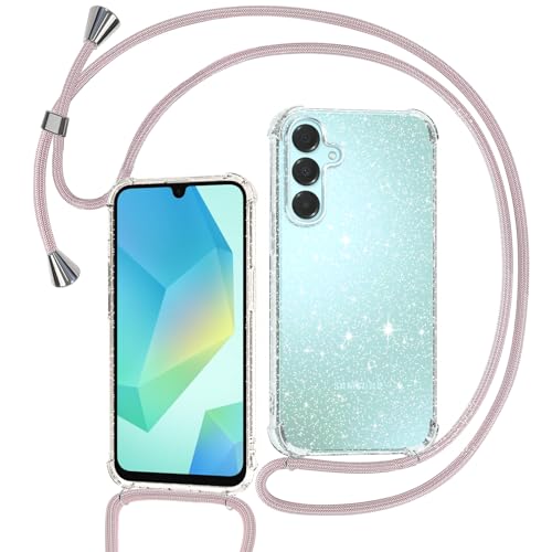 Tikgue Coque pour Samsung Galaxy A16 5G avec Cordon, Collier Coque Glitter Transparent Paillettes Etui TPU Bumper Silicone Case avec Chaîne Lanière Housse - Or Rose