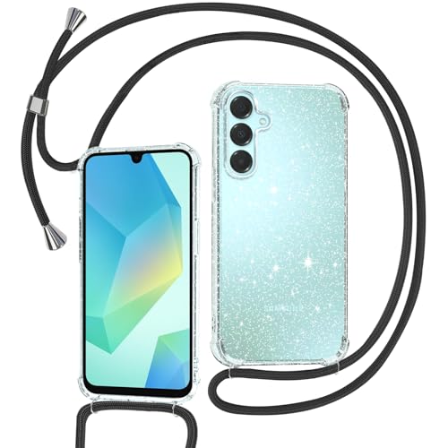 Tikgue Coque pour Samsung Galaxy A16 5G avec Cordon, Collier Coque Glitter Transparent Paillettes Etui TPU Bumper Silicone Case avec Chaîne Lanière Housse - Le Noir