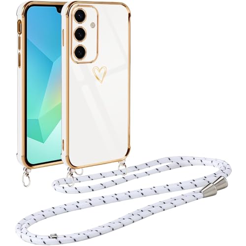 Vauki Coque pour Samsung Galaxy A16 5G avec Cordon de Collier, Galvanisé Etui Housse avec Motif Coeur d'amour, Antichoc Anti-Rayures Case avec Bandoulière pour Samsung A16 5G 6.7", Blanc