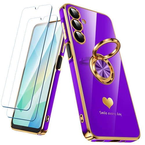 Nonional Coque pour Samsung Galaxy A16 5G avec 2 Films protecteurs d'écran, Anneau Rotatif à 360°, Motif cœurs de Luxe, Bords dorés - Coque Fine et Souple pour Samsung Galaxy A16 5G - Violet Fluo