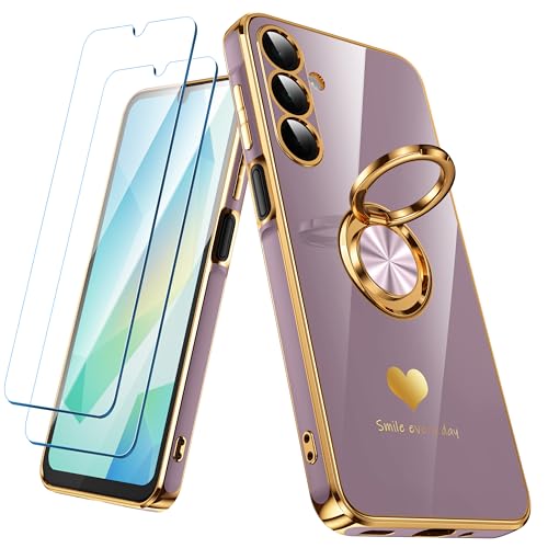 Nonional Coque pour Samsung Galaxy A16 5G avec 2 Films protecteurs d'écran, Anneau Rotatif à 360°, Motif cœurs de Luxe, Bords dorés - Coque Fine et Souple pour Samsung Galaxy A16 5G - Violet Clair