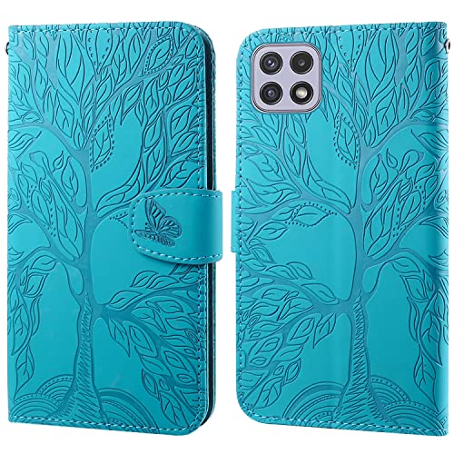 Aisenth Coque pour Samsung Galaxy A22 5G, Arbre de Vie Papillon Motif Housse en Cuir Synthétique Cover à Rabat, Portefeuille Étui de Protection avec Fentes pour Cartes, Bleu Vert