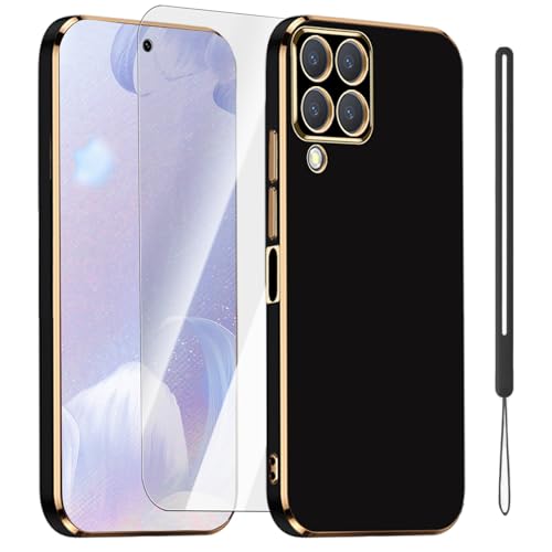 PONRFEKT Coque pour Samsung Galaxy A22 4G Étui avec [Verre Trempé] Fine Placage Mince avec Cadre doré TPU Souple,Antichoc Bumper Housse élégante Etui pour Femmes et Filles-Noir