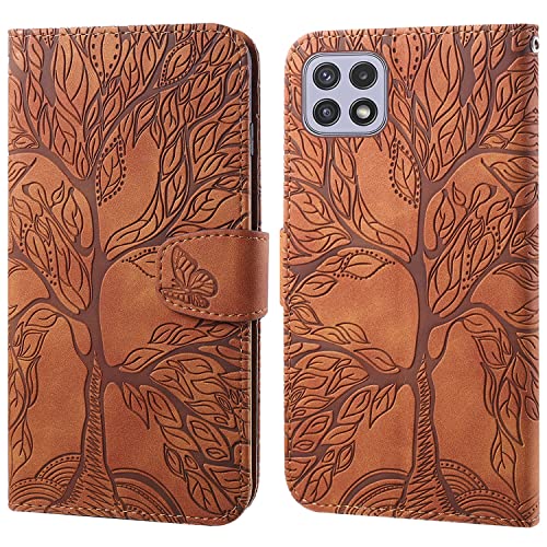 Aisenth Coque pour Samsung Galaxy A22 5G, Arbre de Vie Papillon Motif Housse Case en Cuir Synthétique Cover à Rabat, Portefeuille Étui de Protection avec Fentes pour Cartes, Brun