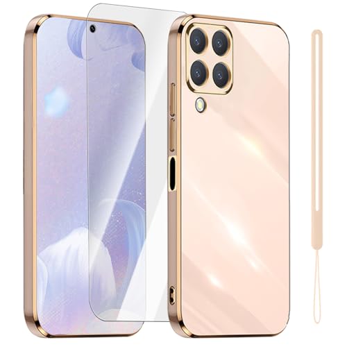 PONRFEKT Coque pour Samsung Galaxy A22 4G Étui avec [Verre Trempé] Fine Placage Mince avec Cadre doré TPU Souple,Antichoc Bumper Housse élégante Etui pour Femmes et Filles-Rose