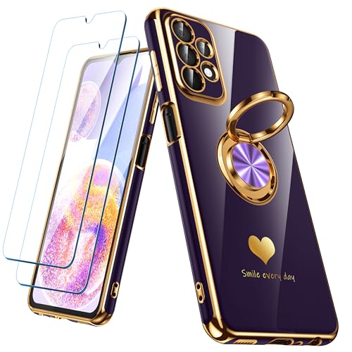 Nonional Coque pour Samsung Galaxy A23 5G/4G avec 2 Films protecteurs d'écran, Anneau Rotatif à 360°, Motif cœurs de Luxe, Bords dorés - Coque Fine et Souple pour Samsung Galaxy A23 5G/4G - Violet
