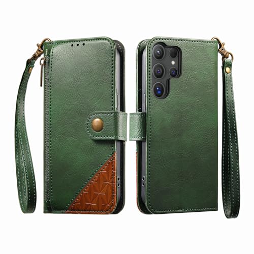 COQUE Étui Portefeuille pour Samsung Galaxy S24 Ultra avec emplacements pour Cartes et Support, Poche zippée, Fermeture à Bouton, dragonne de Protection-Vert