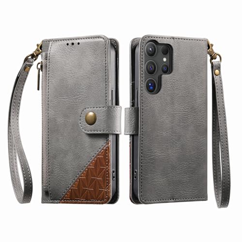 COQUE Étui Portefeuille pour Samsung Galaxy S24 Ultra avec emplacements pour Cartes et Support, Poche zippée, Fermeture à Bouton, dragonne de Protection-Gris