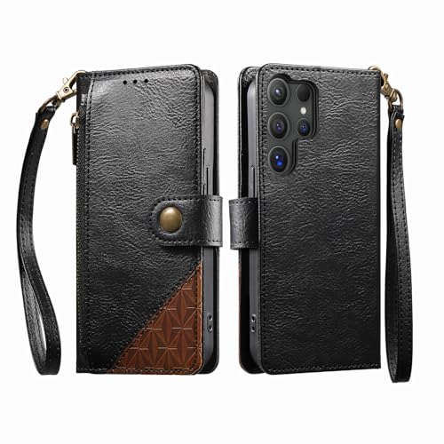 COQUE Étui Portefeuille pour Samsung Galaxy S24 Ultra avec emplacements pour Cartes et Support, Poche zippée, Fermeture à Bouton, dragonne de Protection-Noir