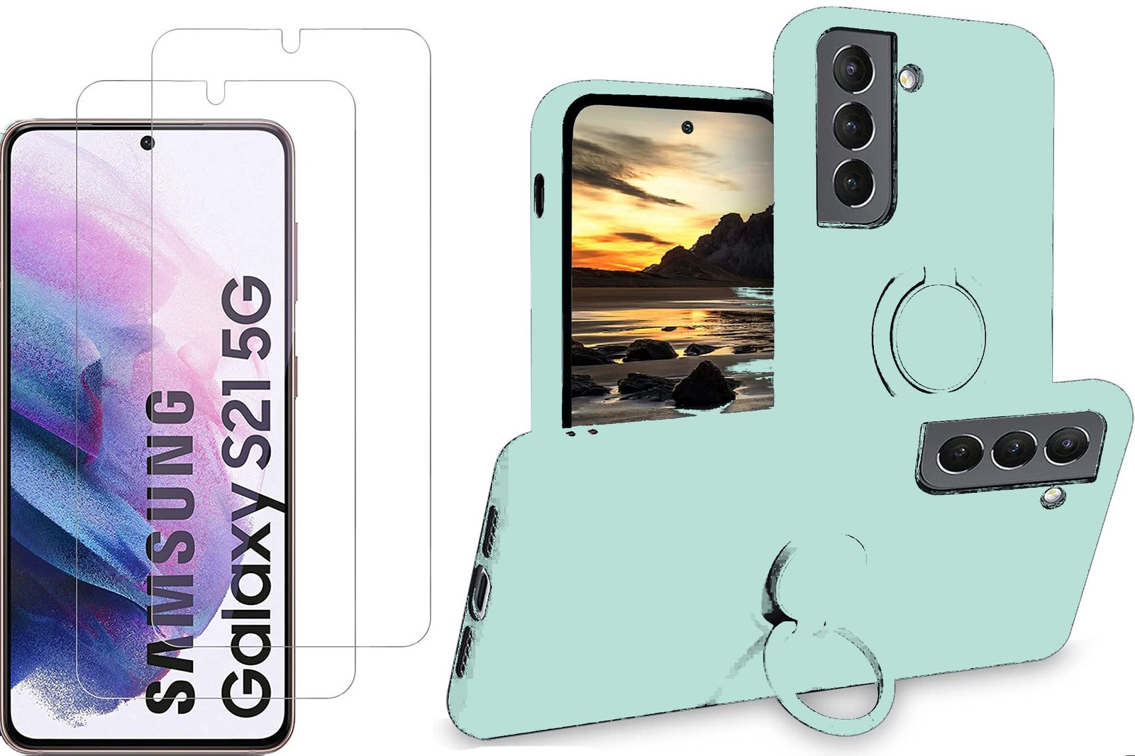 Coque Silicone Pour Samsung S21 5G Couleur Vert Avec Anneau Support + 2 Verres