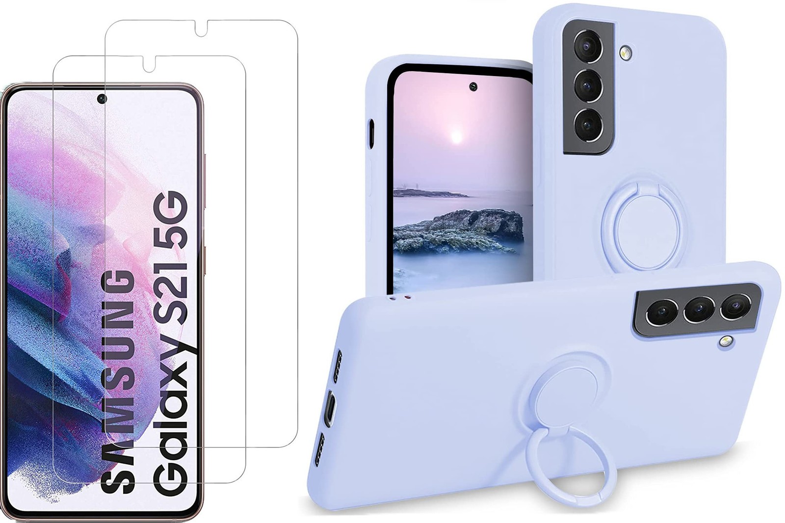 Coque Silicone Pour Samsung S21 5G Couleur Bleu Avec Anneau Support + 2 Verres