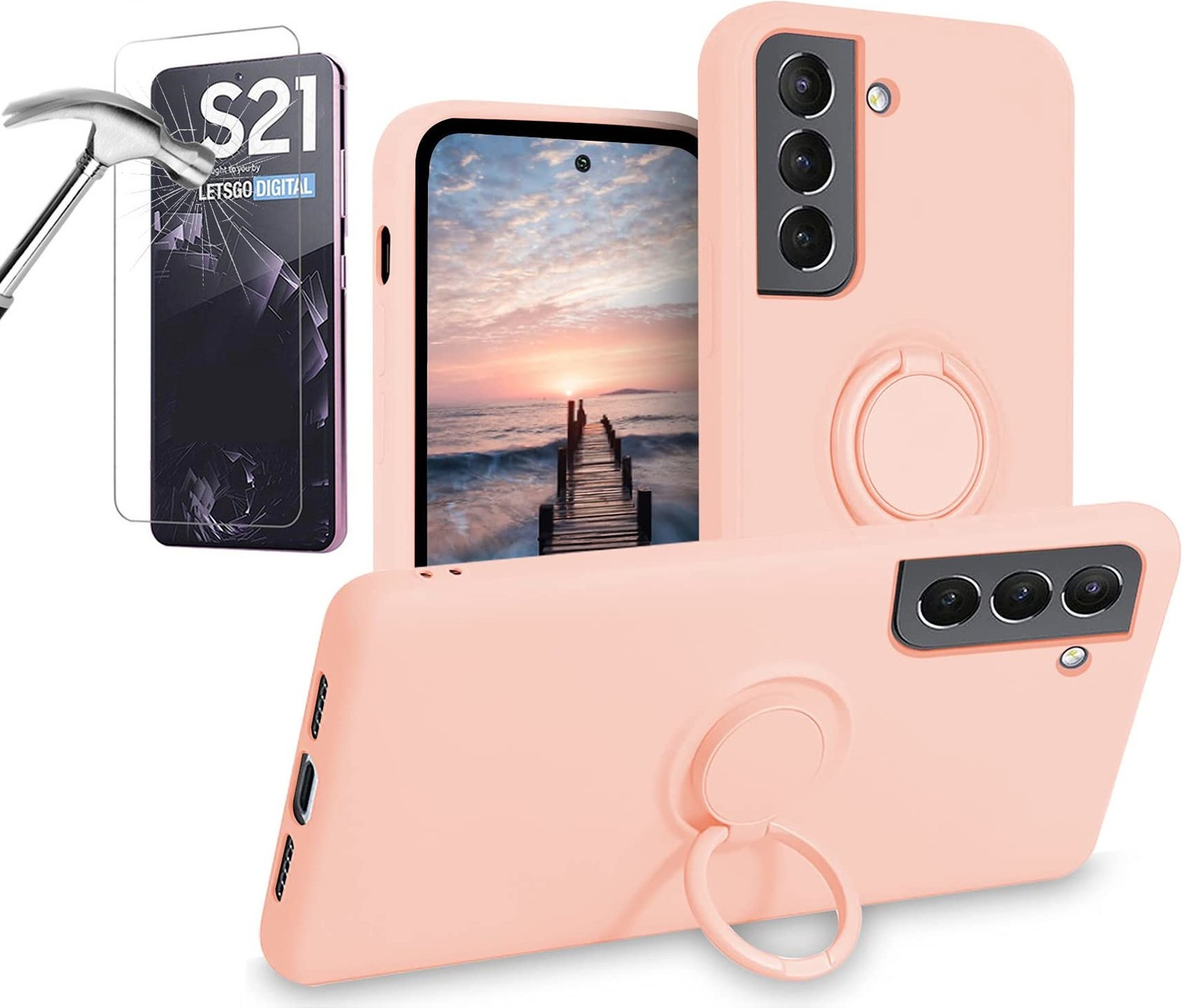 Coque Silicone Pour Samsung S21 5G Couleur Rose Avec Anneau Support + Verre Tre