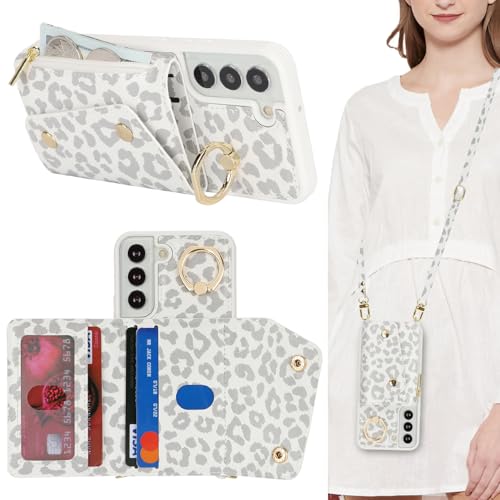 Lipvina Coque pour Samsung Galaxy S22 avec Cordon Porte Carte Coque zippé Portefeuille Femme Telephone Portable Réglable Collier Housse Étui avec Anneau pour Femmes - Léopard Blanc