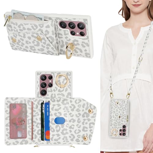 Lipvina Coque pour Samsung Galaxy S22 Ultra avec Cordon Porte Carte Coque zippé Portefeuille Femme Telephone Portable Réglable Collier Housse Étui avec Anneau pour Femmes - Léopard Blanc
