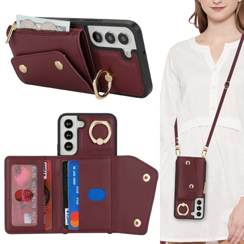 Lipvina Coque pour Samsung Galaxy S22 avec Cordon Porte Carte Coque zippé Portefeuille Femme Telephone Portable Réglable Collier Housse Étui avec Anneau pour Femmes - Rouge