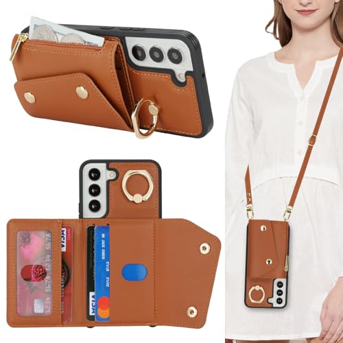 Lipvina Coque pour Samsung Galaxy S22 avec Cordon Porte Carte Coque zippé Portefeuille Femme Telephone Portable Réglable Collier Housse Étui avec Anneau pour Femmes - Marron