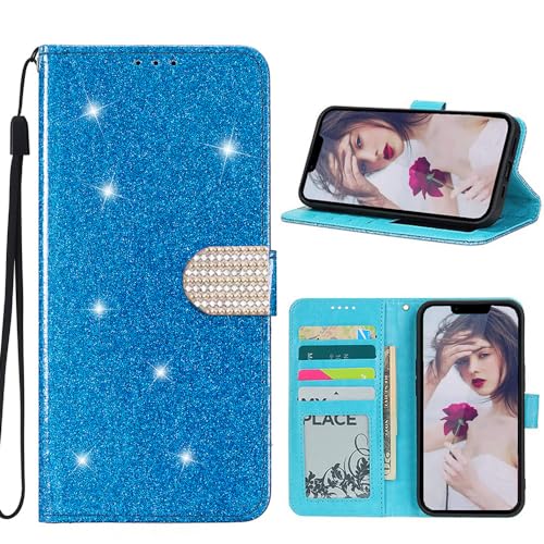 EuoDuo Coque Glitter Compatible avec Samsung Galaxy S22 Ultra Étui Folio en Cuir PU Portefeuille Femme Housse Magnétique Porte Carte Pochette Telephone Portable, Bleu Paillettes