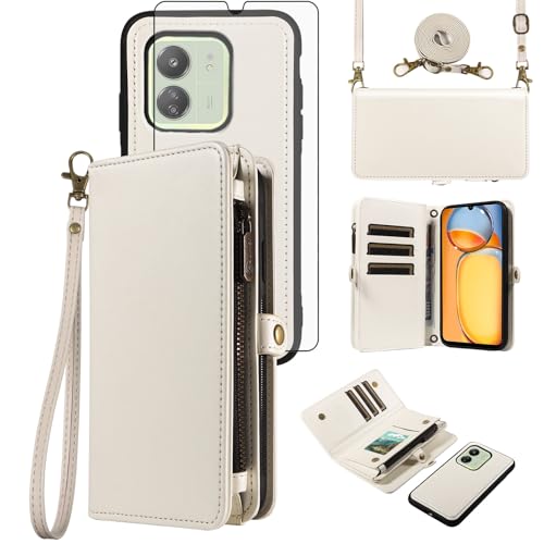 Asuwish Coque pour Xiaomi Redmi 13 C 4G/Poco C65 Portefeuille avec Verre Trempé et Cordon Porte Carte Magnétique Chaine PU Cuir à Clapet Housse Support 13C C13 65C 6.74 Téléphone Case Femme Blanche