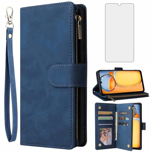 Asuwish Coque pour Xiaomi Redmi 13 C 4G/Poco C65 Portefeuille avec Verre Trempé et Porte Carte Chaine PU Cuir à Clapet Étui Housse Support 13C C13 65C 6.74 Protection Téléphone Case Femme Homme Bleu