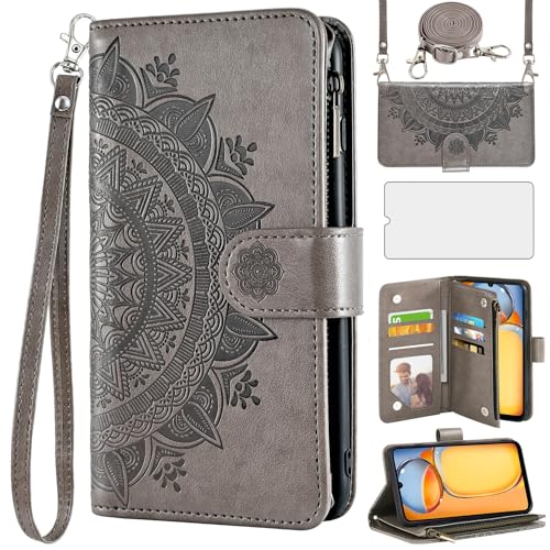 Asuwish Coque pour Xiaomi Redmi 13 C 4G/Poco C65 Portefeuille avec Verre Trempé et Cordon Porte Carte Chaine PU Cuir à Clapet Mandala Étui Housse Support 13C C13 65C 6.74 Téléphone Case Femme Gris