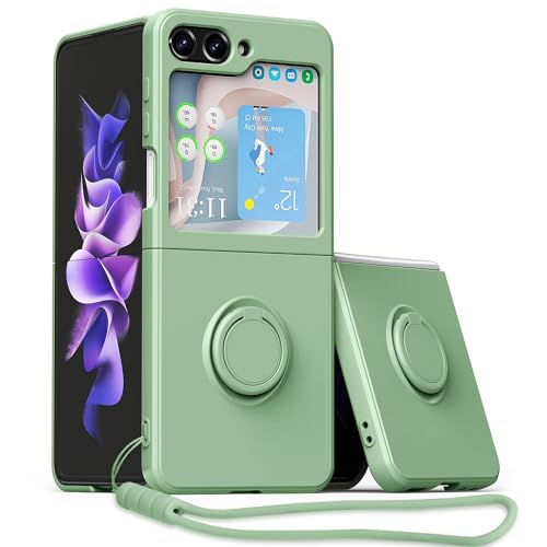 UEEBAI Silicone Coque avec Ring pour Samsung Galaxy Z Flip 5 5G, Etui Fin Pliable et léger Absorption des Chocs Housse avec Hand Strap Bague 360 Degrés Rotation Stand Protection Cover, Vert Matcha