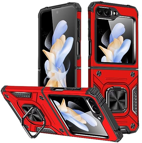 KANSi Coque pour Samsung Galaxy Z Flip 5, Housse TPU Silicone Rotation 360° Aimant Anneau Support Double Défense Protection Etui - Rouge