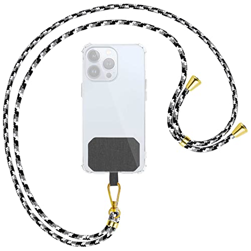 mtb more energy® Chaîne universelle pour téléphone portable - Noir et blanc - Pièces métalliques de couleur or - Compatible avec de nombreuses coques de téléphone portable - Cordon à accrocher autour