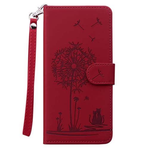 FALUWONRU Mignon Animé Chat Pissenlit de Dessin Coque pour Samsung Galaxy A12/M12 Coques Téléphone Protection Etui【Protection Antichoc】【Soutenir La Debout】【Coque Portefeuille】【étuis à Rabat】,Rouge