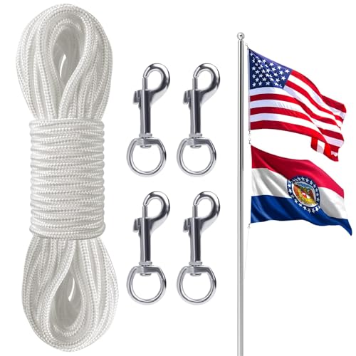 20M Corde pour Drapeau,Corde d'escalade,Corde en Nylon avec 4 Crochets en métal,Corde Balancoire Exterieur,pour mât de Drapeau, vêtements, Jardin, Camping (Blanc)