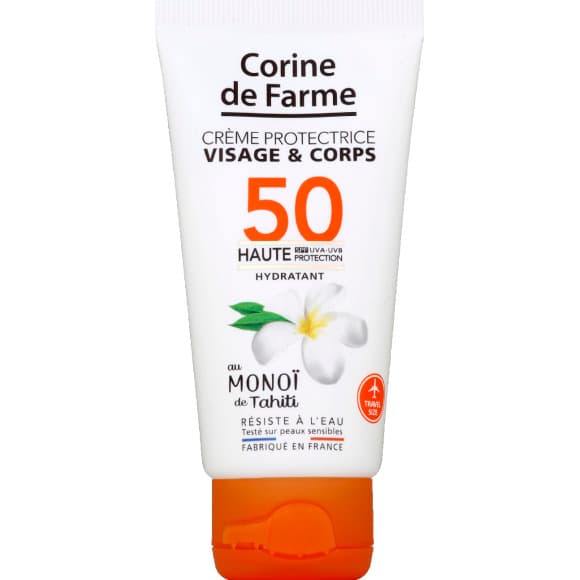 Corine de Farme - Crème Protectrice SPF50 Haute Protection UVA-UVB - Crème Solaire Visage et Corps, Sans Paraben, Résiste à l’Eau - Monoï de Tahiti - 50 ml