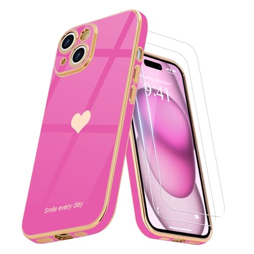 Teageo Coque pour iPhone 15 en Silicone Galvanisé Or Ultra Mince avec Motif Coeur d'amour Mignon Housse Étui de Protection Complète du Corps Antichoc pour iPhone 15, Rose Pink