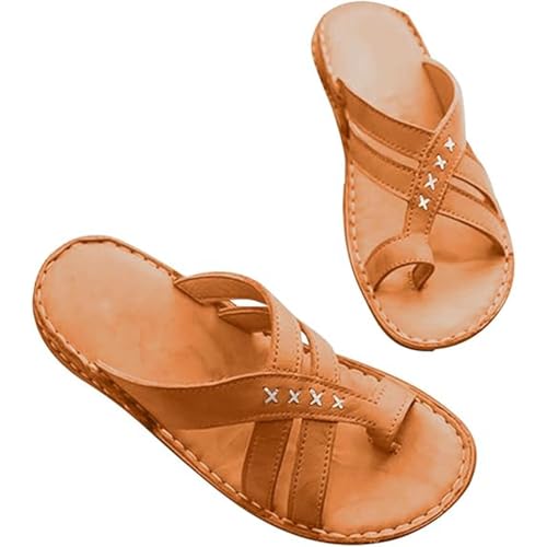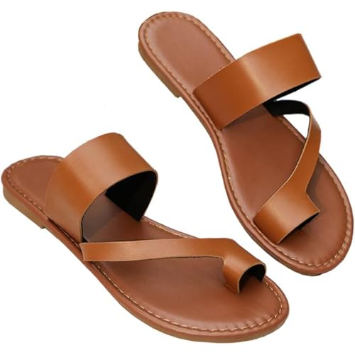 Sandales Plates pour Femmes, Mules à Enfiler avec Boucle d'orteil, Tongs d'été en Cuir PU pour la Plage, Les Voyages, correcteur d'oignon valgus(Marrone,40 EU)