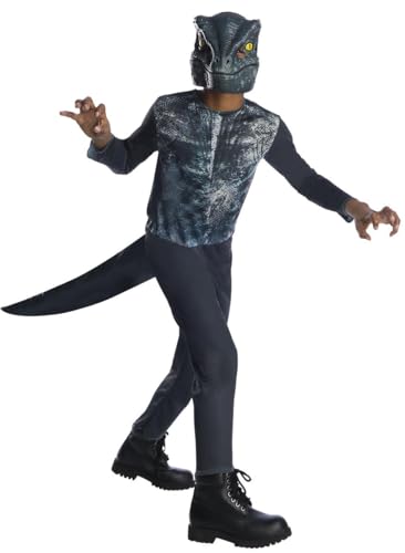 Rubies Costume de dinosaure Velociraptor pour garçon, combinaison imprimée officielle du film Jurassic World avec masque et couvre-bottes attachés pour Halloween, Noël, carnaval et anniversaire