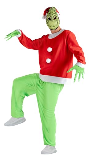 Chaks - Costume Le Grinch™, ensemble de 5 pièces pour adultes, pour le carnaval, tenue de Noël avec masque, casquette, haut, pantalon, gants