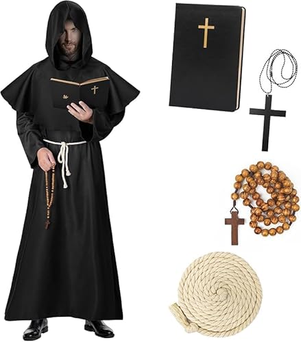 Haozozo Deguisement Halloween Homme,Costume Halloween Homme Comprenant Une Robe De Moine, Une Soutane, Un Carnet Classique Et Une Décoration En Forme De Croix - Costume Moine MédiéVal Adulte (L)