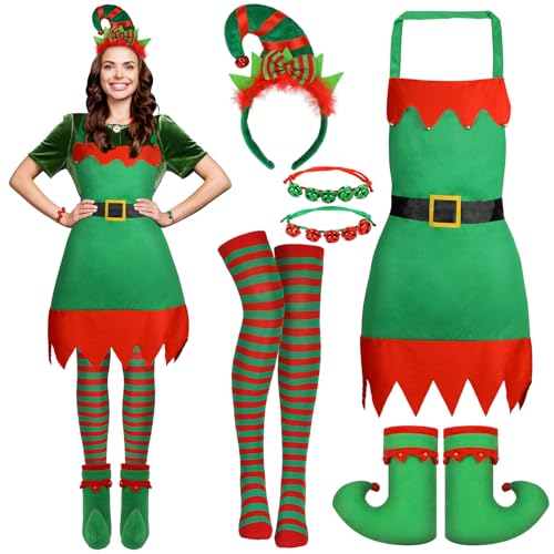 Beipegin Costume Lutin Femme,Tablier Noel Bonnet Lutin Serre Tete Noel Chaussettes Chaussure Lutin Bracelets Deguisement pere Noel Adulte Costume pere Noel Accessoires Noel Lutin Cosplay