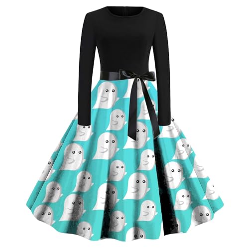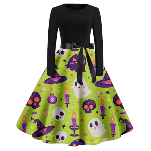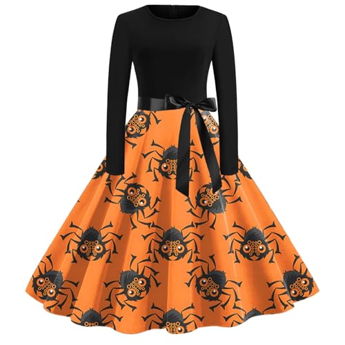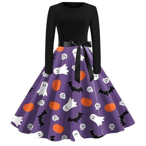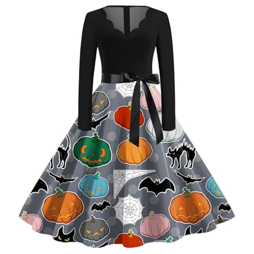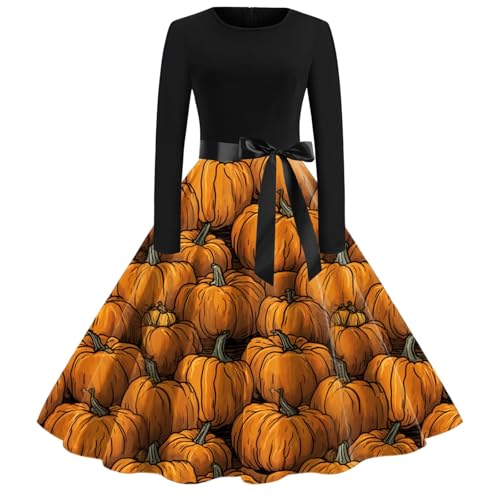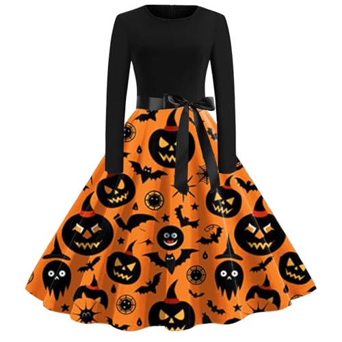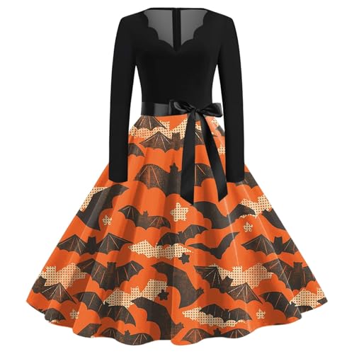 Generisch Costume de sorcière pour femme - Robe d'Halloween gothique à manches longues - Robe de cocktail swing - Motif citrouille et chauve-souris - Avec nœud et ceinture - Robe de fête pour femme