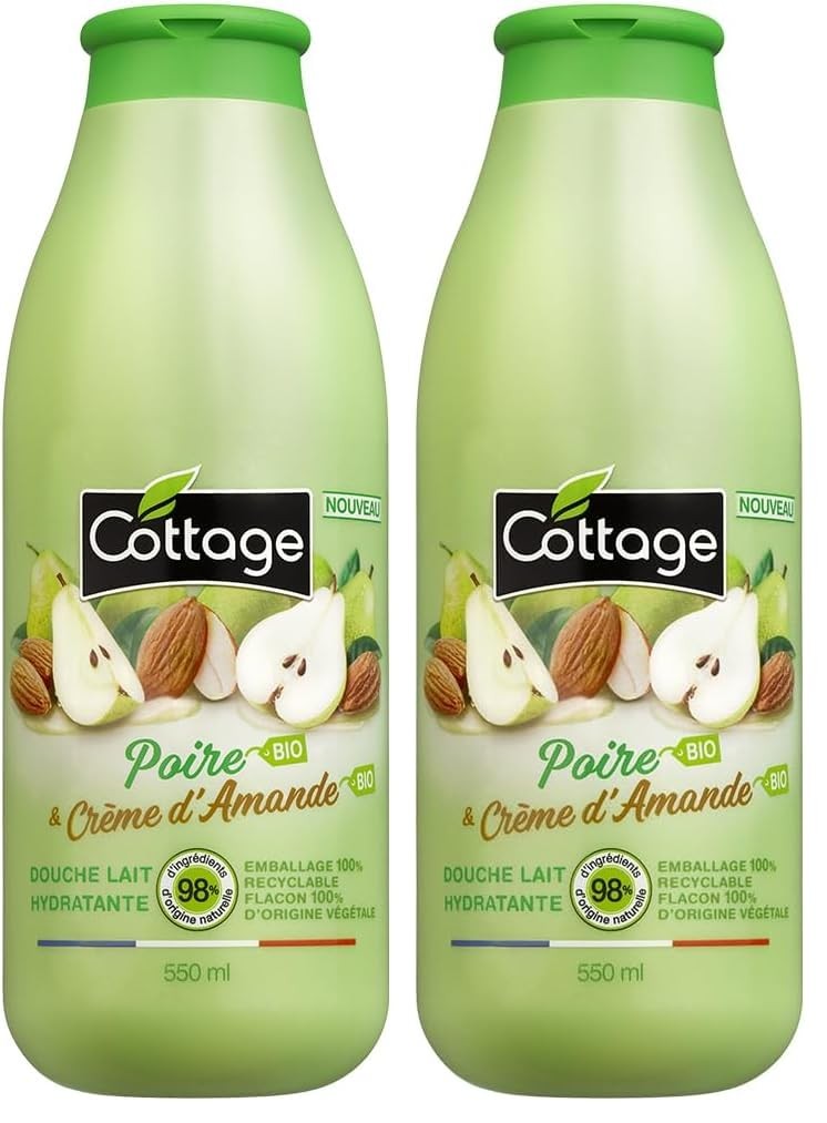 Cottage – Gel Douche Lait Hydratant – Poire BIO & Crème d'Amande BIO – 98% D’Ingrédients D’Origine Naturelle - Flacon 100% d'origine végétale– Fabriqué en France – 550 ml (Lot de 2)