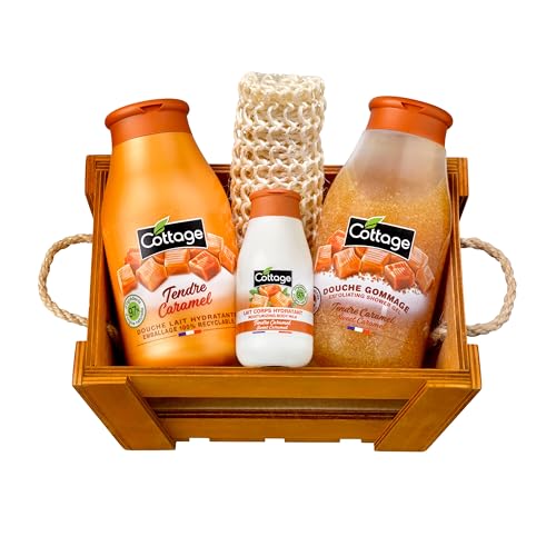 Cottage Coffret Cadeau Tendre Caramel - 1 Gel douche + 1 Douche Gommage + 1 Lait Corps Hydratant + 1 gant exfoliant - Fabriqué en France